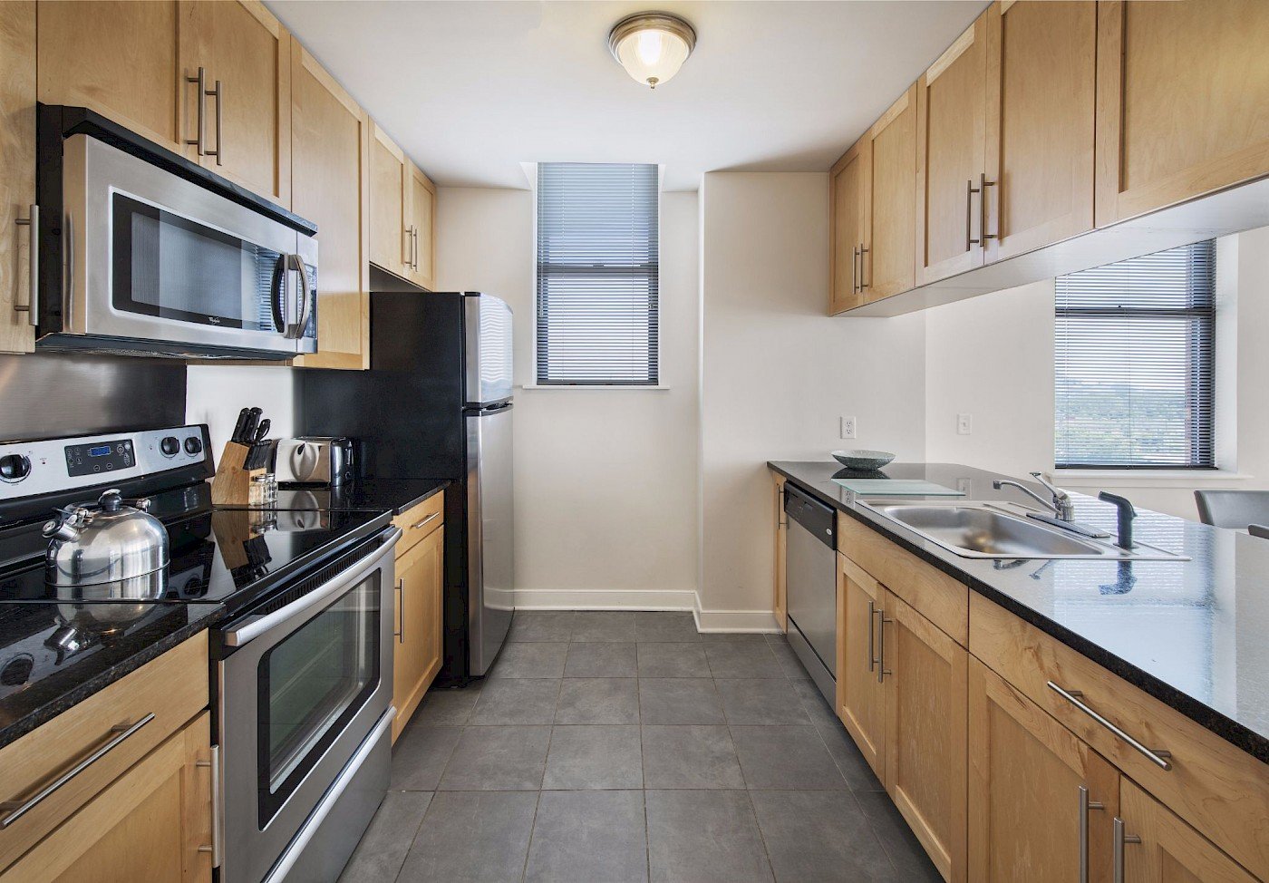 - Stainless steel dishwasher, microwave, and range