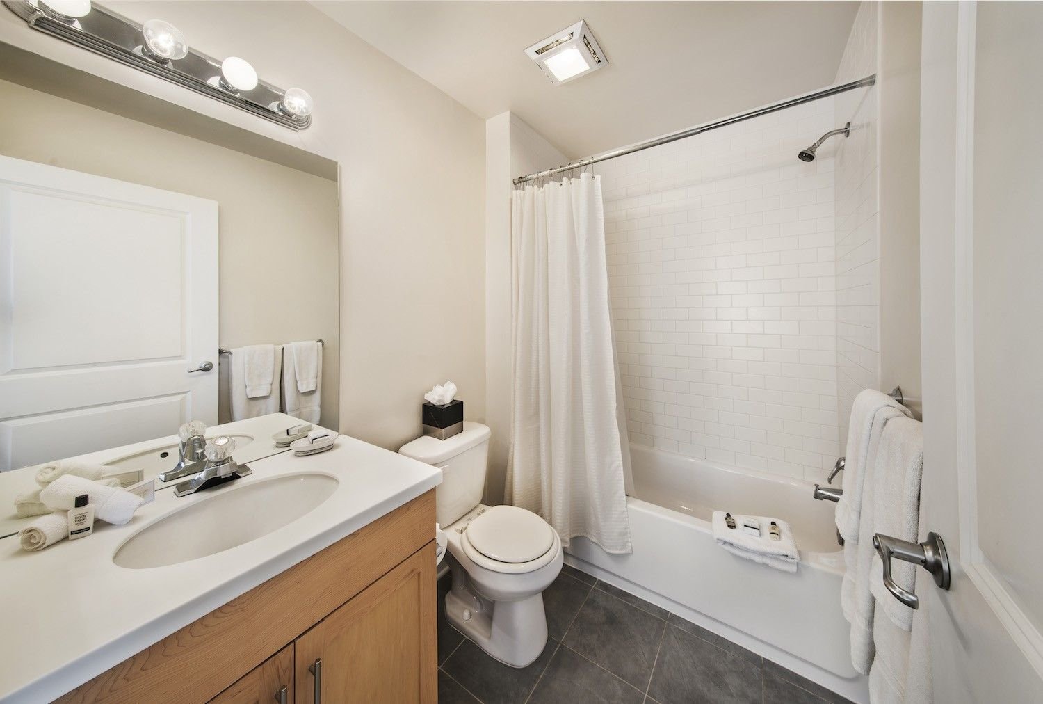 - Shaker-style maple vanity with white Corian countertops